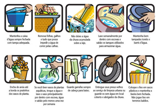A fêmea do mosquito deposita seus ovos onde existe água parada, portanto, jogue fora pneus velhos, garrafas e qualquer recipiente que pode acumular água, não deixe água empoçada no terreno e deixe vedadas caixas d´água e cisternas.