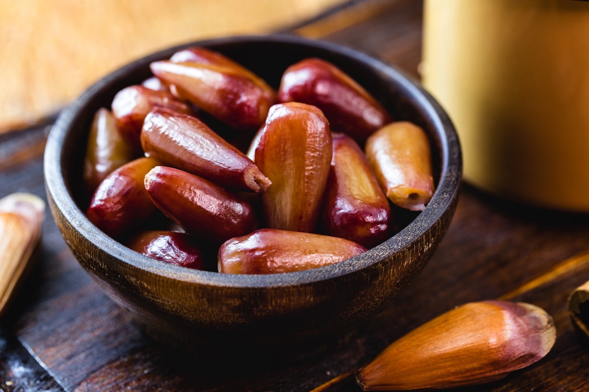 Famoso no Paraná, principalmente, o pinhão vem das árvores que permeiam o território. Em geral, é cozido em água e sal. Repleto de nutrientes, ele é mais consumido de abril a julho e marca presença nas festas juninas.