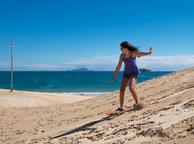 As dunas da Praia da Joaquina ficam pertinho da Lagoa da Conceição. Nelas, dá para praticar um esporte radical semelhante ao snowboard: o sandboard. Pois é, na falta de neve, a areia é uma substituta à altura.
