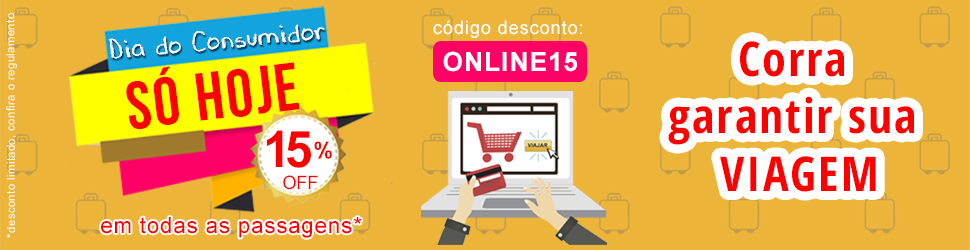 Hoje é Dia do Consumidor, e queremos deixar o nosso muito obrigado a você, cliente, que confia em nosso trabalho! E para mostrar toda nossa gratidão, estamos com um desconto super especial. Ganhe 15% de desconto, em todas as passagens, só inserir o código: ONLINE15.