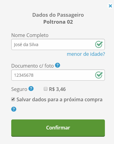 Insira os dados do passageiro, tais como nome completo e documento com foto. O documento informado deverá ser o mesmo a ser utilizado para retirar as passagens no guichê da empresa.