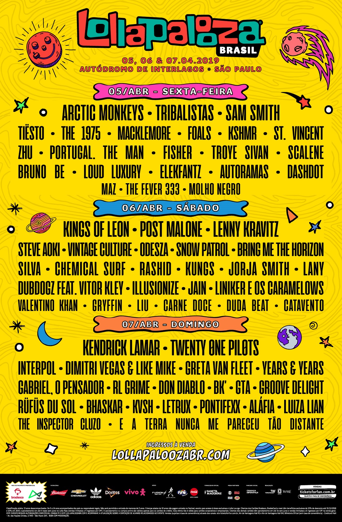As principais atrações do primeiro dia são Arctic Monkeys, Tribalistas, Sam Smith e Tiësto. No sábado, quem tem maior atenção nos palcos é Kings of Leon, Post Malone, Lenny Kravitz e Steve Aoki. Os últimos shows, no dia 07 de abril, ficam por conta de Kendrick Lamar, Twenty One Pilots e Dimitri Vegas & Like Mike.